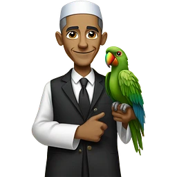 Barack Obama in Jewish orthodox clothing with a parrot on his shoulder and doing a peace sign emoji