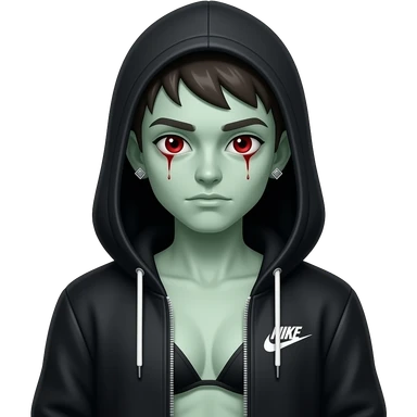 izombie boy with a with c cups, pale green skin, black nike tech, hoodie and red bloody eyes and square diamond stud earrings and the hoodie over his head emoji