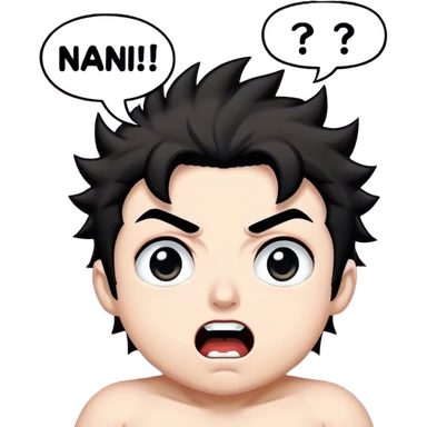 Create an anime-style emote featuring an exaggerated shocked expression. The face should have wide, bulging eyes, raised eyebrows, and an open mouth, as if shouting. Add a jagged speech bubble or impact effect to emphasize the exclamation. Include the bold, capitalized text “NANI?!” in a dramatic, comic-book style font. Enhance the intensity with spiky background lines or manga-style emphasis strokes. Optionally, incorporate a sweat drop, exclamation mark, or red/orange highlights on the face to convey heightened emotion. The emote should have a chibi-style, pixel art, or high-contrast shadowed variation to match different artistic interpretations of the iconic anime reaction. emoji