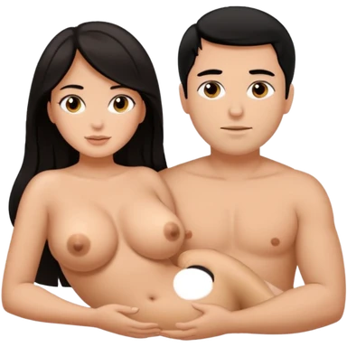 Thick Dark haired girl with big butt and big breasts laying naked next to a white male with black hair and big penis emoji