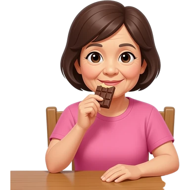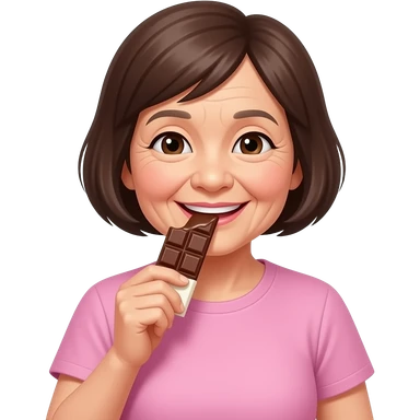 Asian grandma wearing pink tshirt with short brown hair eating chocolate emoji