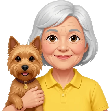 Asian grandma wearing yellow polo shirt with short white hair carrying brown terrier emoji