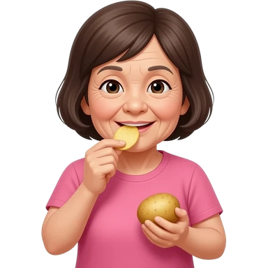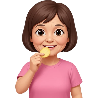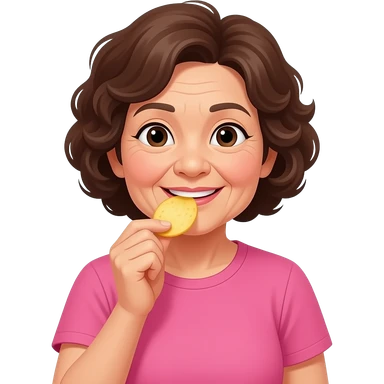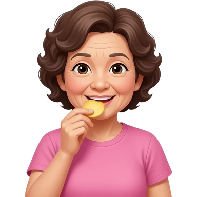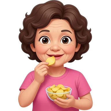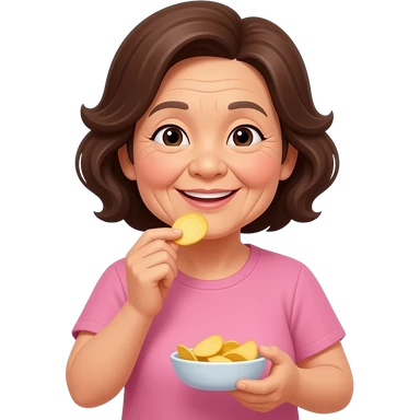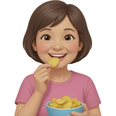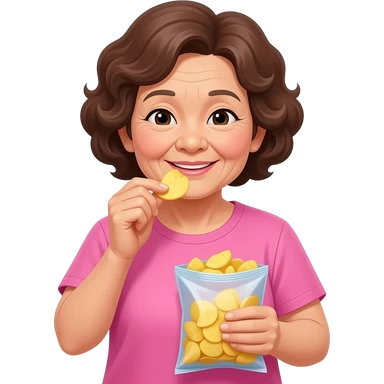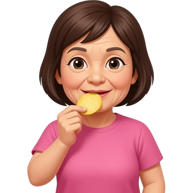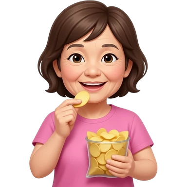 Asian grandma wearing pink tshirt with wavy short brown hair eating potato chips emoji