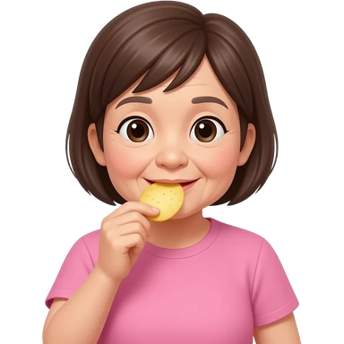 Asian grandma wearing pink tshirt with short brown hair eating potato chips emoji