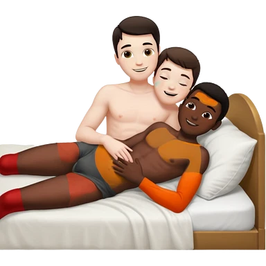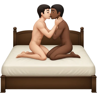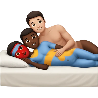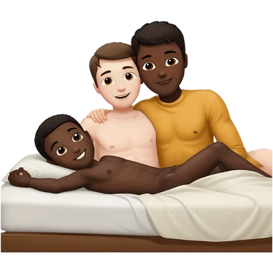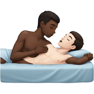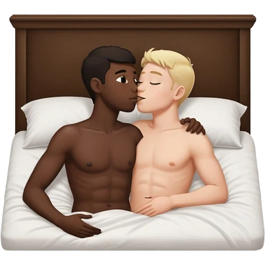 Dark hair White male laying back on the bed naked kissing black male emoji
