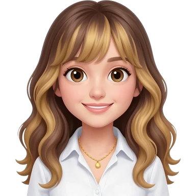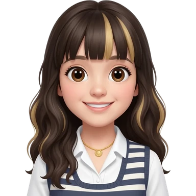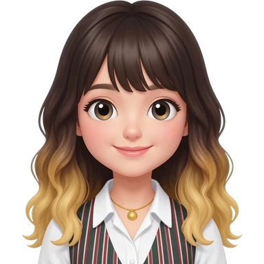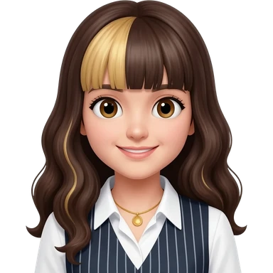 a girl with long lenght dark brown wavy hairs with bangs and blonde ends of the hair. big eyes and soft features and with the sincere smile. outfit is white shirt with a golden necklace and add stripet west top of it emoji