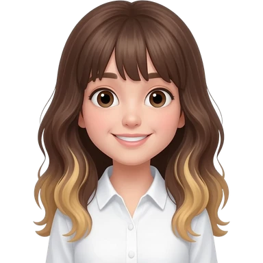 a girl with long lenght brown wavy long hairs with bangs and blonde tones to the ends. big eyes and soft features and with t feaa sincere smile, and the head slightly to the side. outfit is white shirt emoji