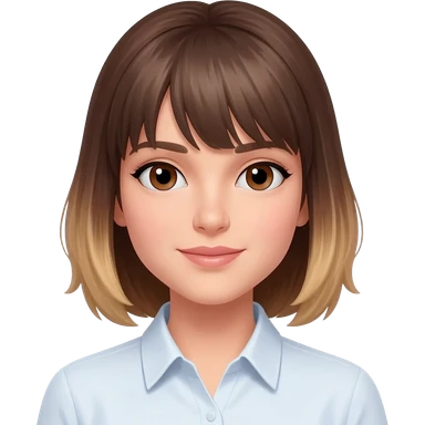 Young woman with soft feminine features and an oval face. Light-brown eyes with subtle eyeliner and lashes, and medium-thick eyebrows. Medium-length layered hair with soft waves and curtain bangs, medium brown with caramel highlights at the ends. emoji