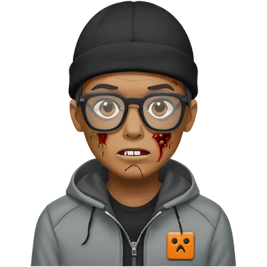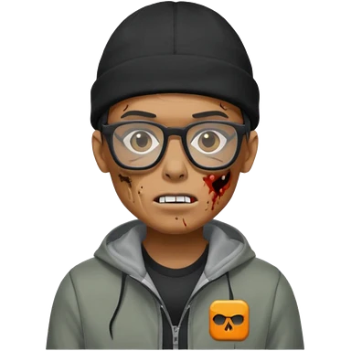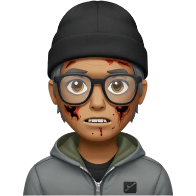 Hazme un zombie con gafas cuadradas y el marco negro y un gorro negro y un saco Nike tech gris y haz el personaje moreno emoji
