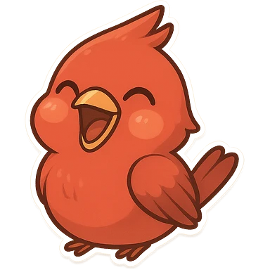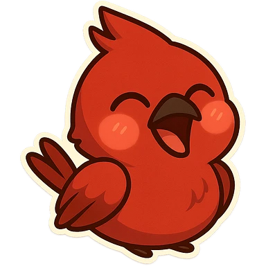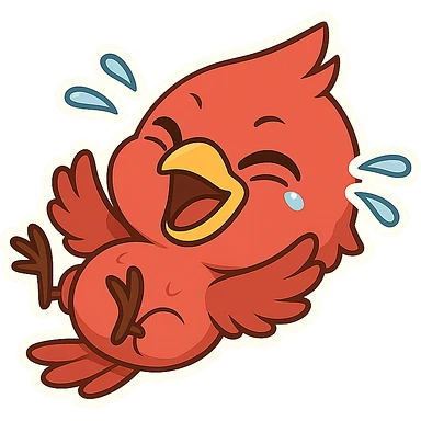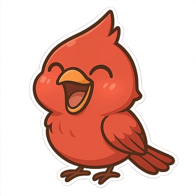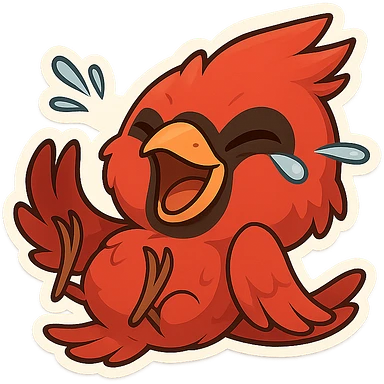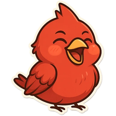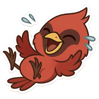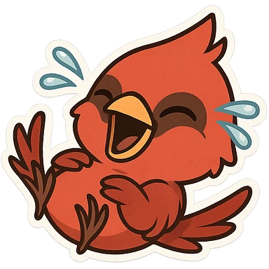 Male Cardinal (bright red) "Laughing male cardinal bird, eyes closed, beak open wide, joyful expression, feathers slightly puffed, cartoon emoji style. emoji