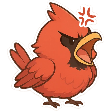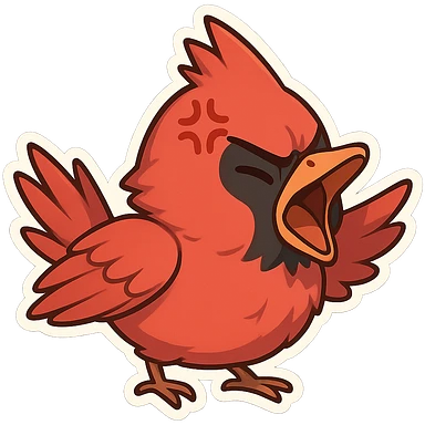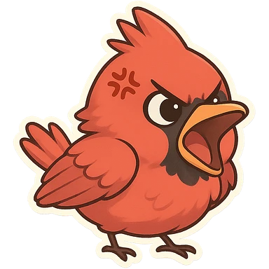 Chibi-style male cardinal yelling with open beak, feathers fluffed, exaggerated anime anger mark above eye. emoji