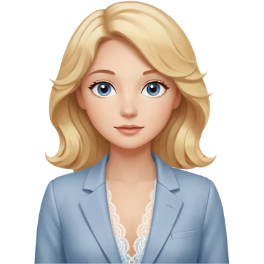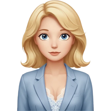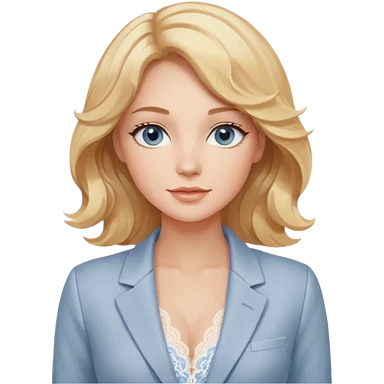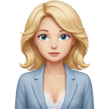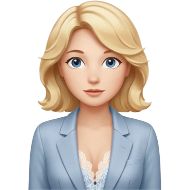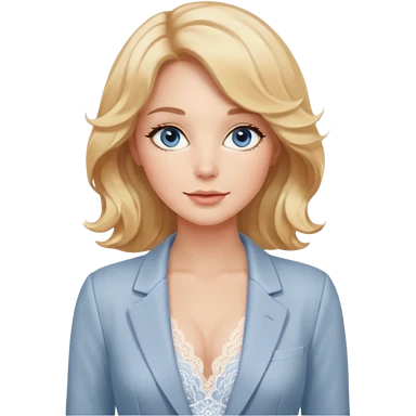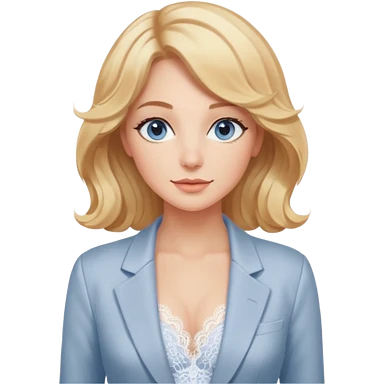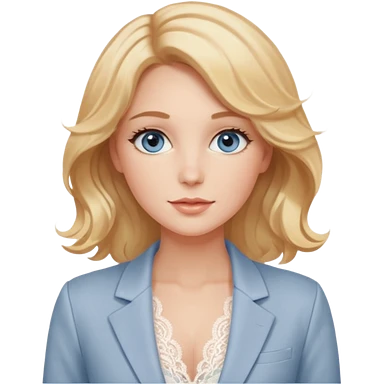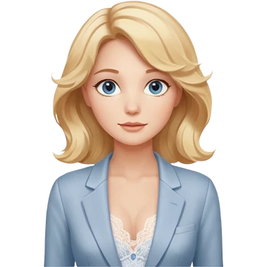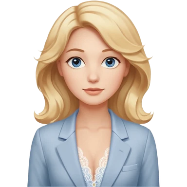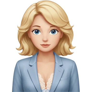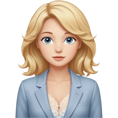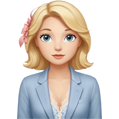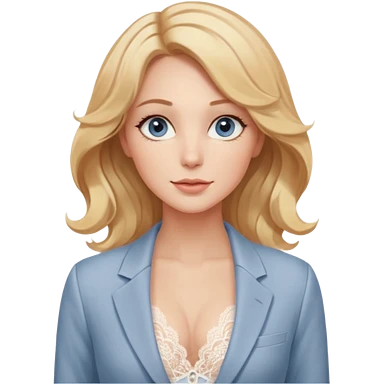 A gentle woman with fair skin, wavy honey-blonde hair, and calm gray-blue eyes. She wears blush lace lingerie and a white blazer, radiating soft confidence and warmth. emoji