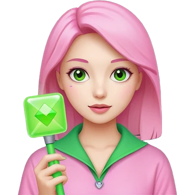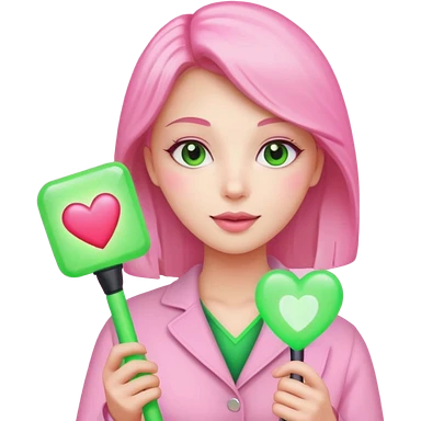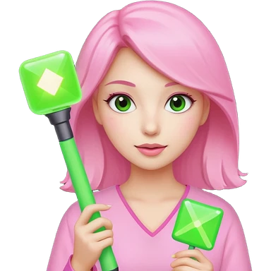 네모난 초록색 응원봉을 들고있는 분홍색 옷을 입고 있는 사랑스러운 여자 emoji