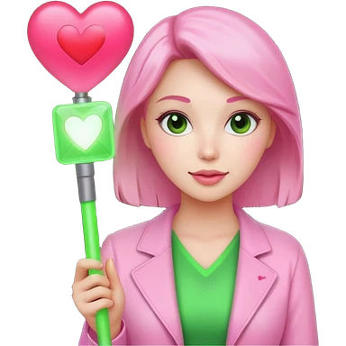 A lovely woman in pink with a square green light stick and with heart emoji