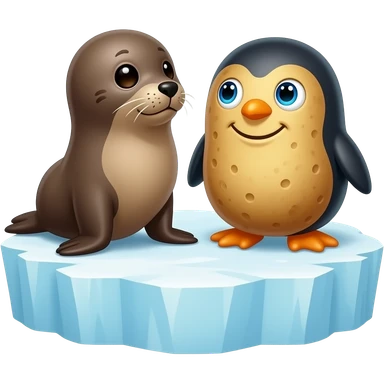 Please make a fur seal-shaped and a potato that is penguin-shaped next to it. And they are playing peek a boo on the iceburg . emoji