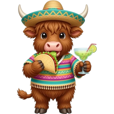 animated highland cow eating tacos and guacamole,wearing a pancho and sombrero drinking a margarita emoji