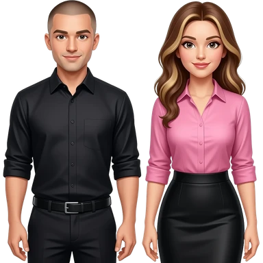 Emoji of a White man with Brown eyes shaved hair wearing black shirt with woman with Brown and blonde hair wearing a pink shirt and black skirt with Brown eyes emoji