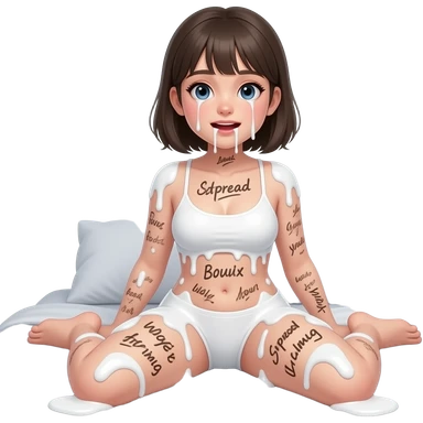 30 year old girl, big , big , thick white liquid all over, bound body, ,(((spread your legs))), cute face, face, realistic face, petite body, body covered in writing , drooling out of mouth, on bed, , not wearing clothes emoji