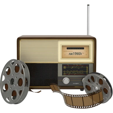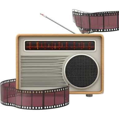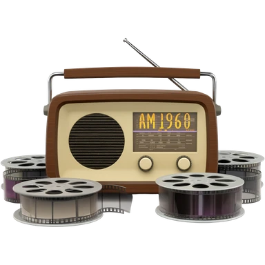 una radio que en su visor dice AM1960 en su rededor rollos de películas emoji