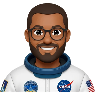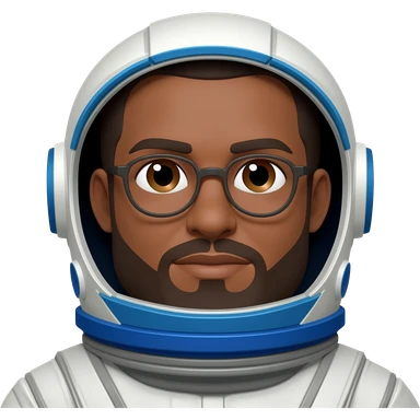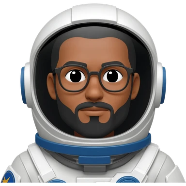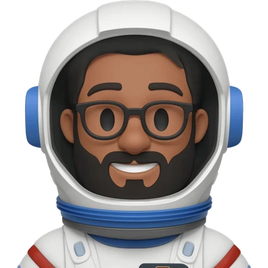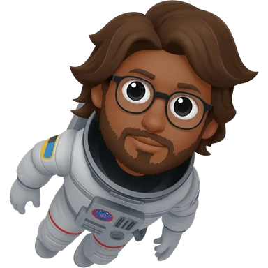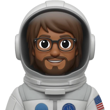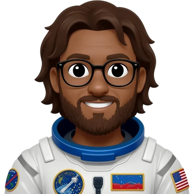 astronaut brown skin, black eyes, glasses and beard smiling a bit long hair emoji