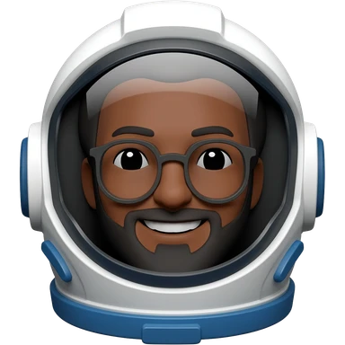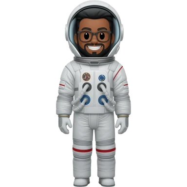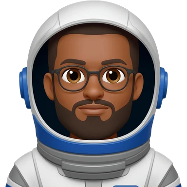 astronaut with helmet in space brown skin, black eyes, glasses and beard smiling black hair show body emoji