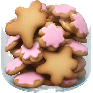 Realistic glass cookie jar with light pink lid full of gingerbread cookies isolated. emoji