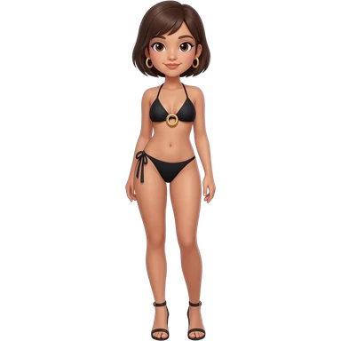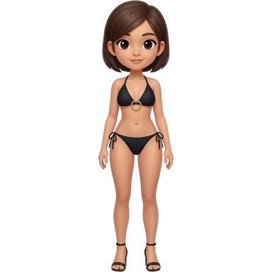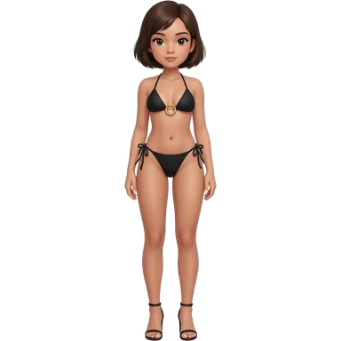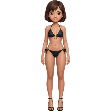 Filipino girl black triangle top gold o ring top bikini and tie tanga bikini bottom full body slim stand straight with high heels sandals brown short hair emoji