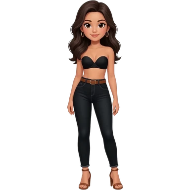 Filipino girl black bra strapless top and high waisted black jeans with brown belt with feet stand straight body wear pageant high heels sandals brown emoji