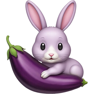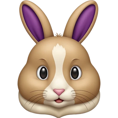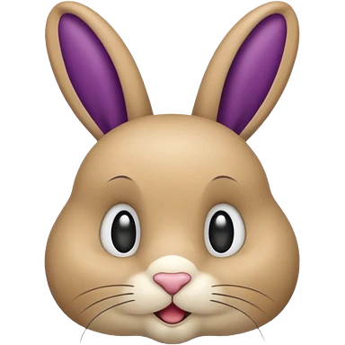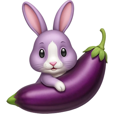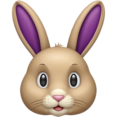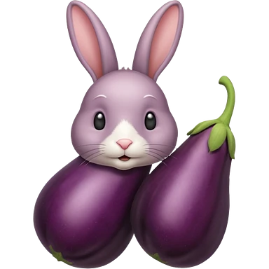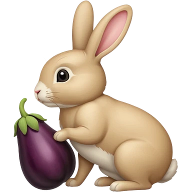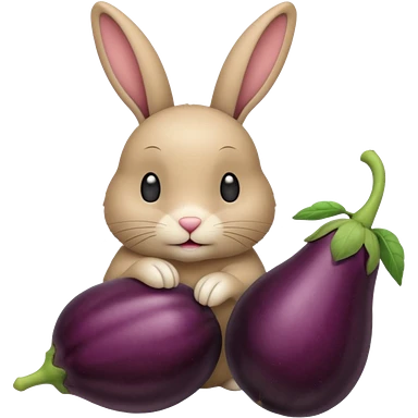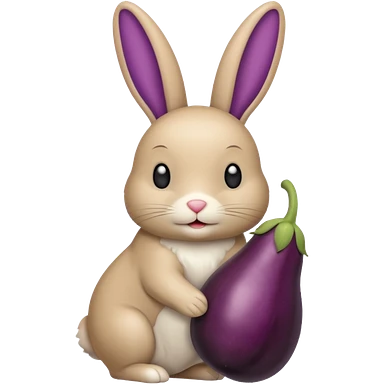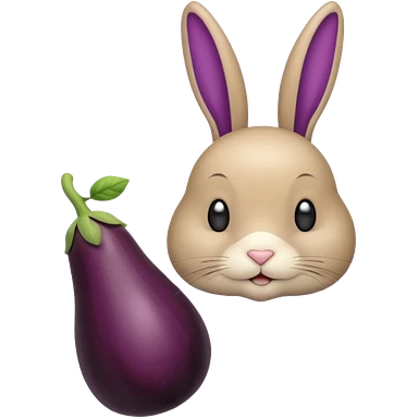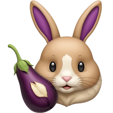 Un lapin beige qui a les oreilles qui tombent avec une aubergine sur la tête emoji