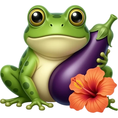 Grenouille qui tient une enorme aubergine, et un hibiscus en haut a droite de l'aubergine emoji