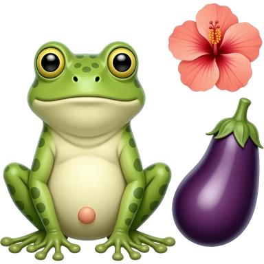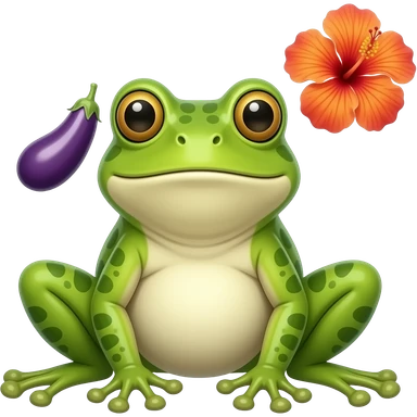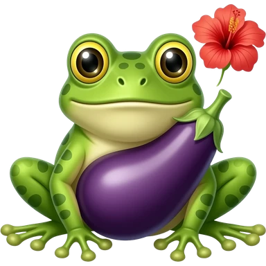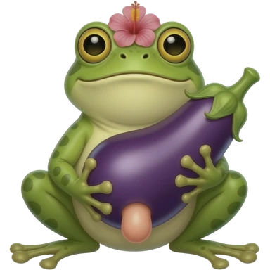 A frog with a big eggplant at the spot of penis and an hibiscus on the right to the upper side of eggplant emoji