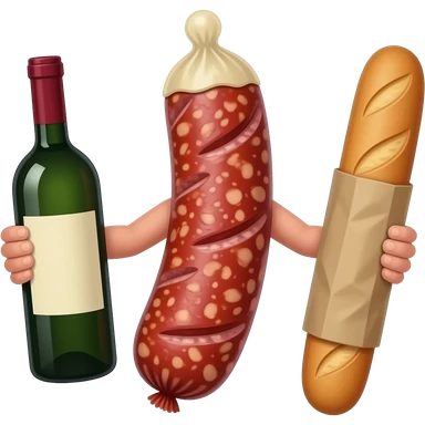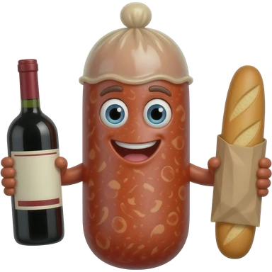 Full Sausage with a condom up to tip. The sausage has arms with a bottle of wine in one hand and a baguette in the other. The condom should look like a real condom emoji