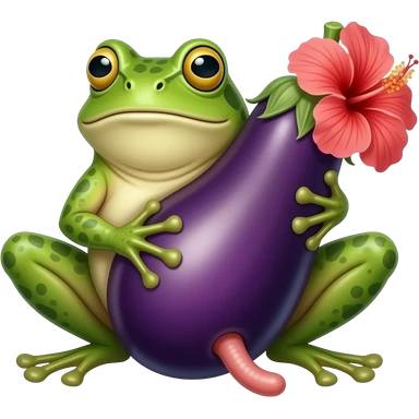 A frog with a big eggplant at the spot of penis and an hibiscus near the tip of eggplant emoji