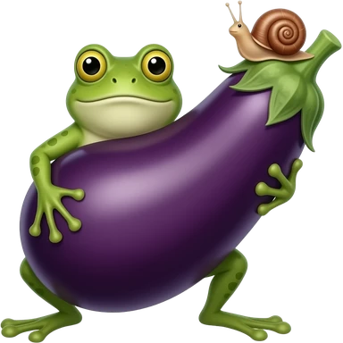 Grenouille qui tient une enorme aubergine, comme si c'était son penis et un bigorneau au bout de l'aubergine emoji