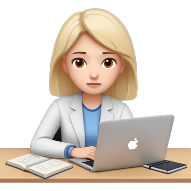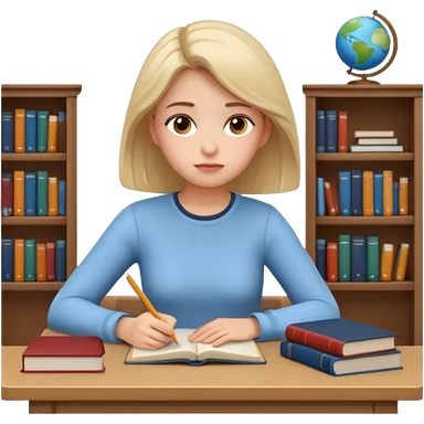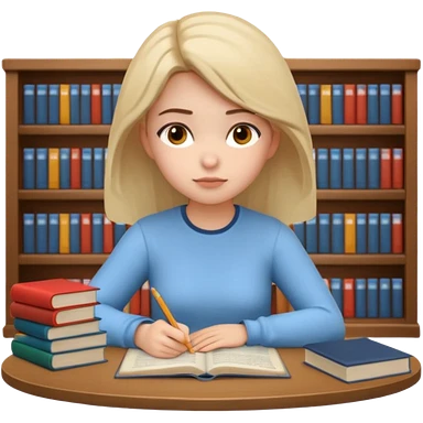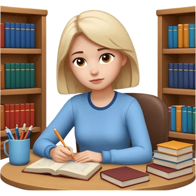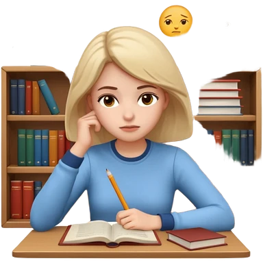 3D emoji style sticker, young woman, white background, sitting at a table with books and a notebook, calmly studying, thoughtful and slightly serious expression, slow focused learning mood, casual outfit, soft lighting, minimalistic, clean astrology emoji style emoji