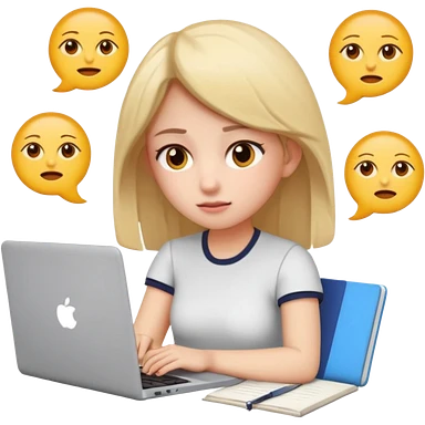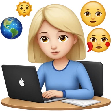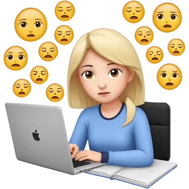 3D emoji style sticker, young woman, white background, slight exam stress, sitting with a laptop, IELTS practice test on the screen showing Overall 5.5, tired but determined expression, notebooks and papers around, soft lighting, minimal details, clean aesthetic, astrology style emoji