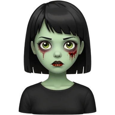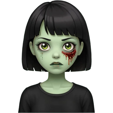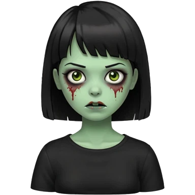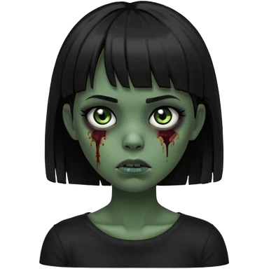 Zombie girl emoji verde escuro com cabelo curto liso preto no ombro e franja na altura da sobrancelha cobrindo completamente a testa, usando uma blusa preta, com olhos castanhos escuros emoji