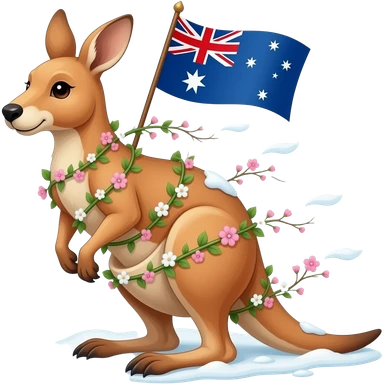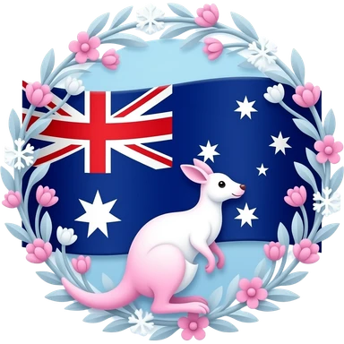 Lots of pink and white vines, wind swirls, snow, and flowers wrapped around the Australian flag with a white and pink Kangaroo emoji