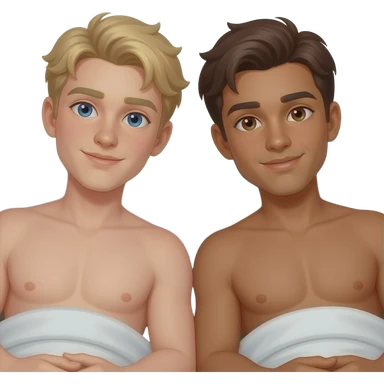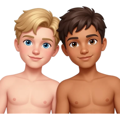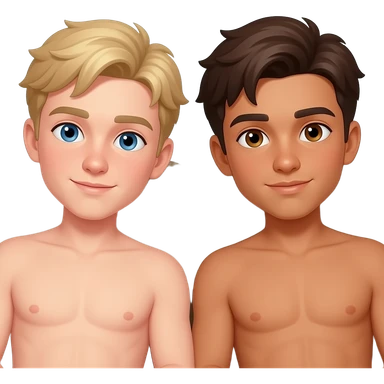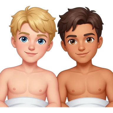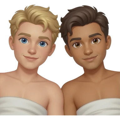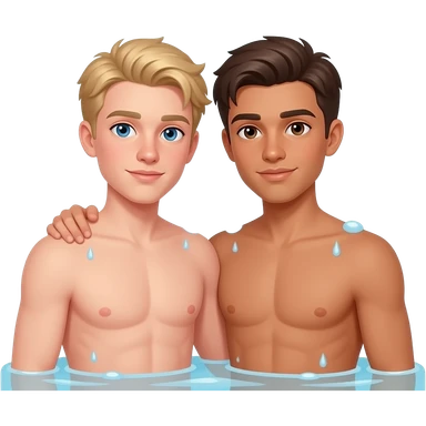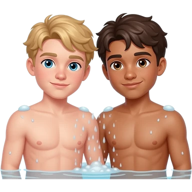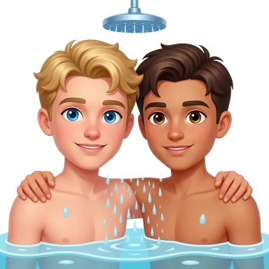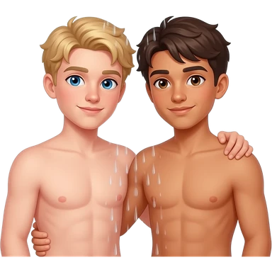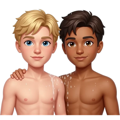 Make a young gay teen couple on a Date , one has light Skin with Blond Hair and Blue Eyes, the other one has slightly brown skin witz dark Brown Hair and Brown Eyes. They are shirtless together in the shower. emoji