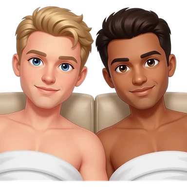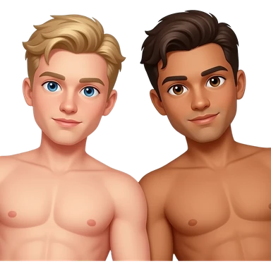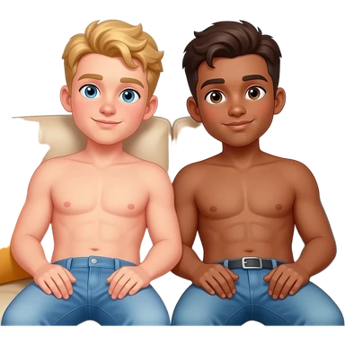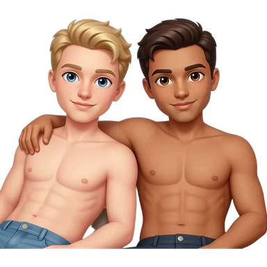 Make a young gay teen couple on a Date , one has light Skin with Blond Hair and Blue Eyes, the other one has slightly brown skin witz dark Brown Hair and Brown Eyes. They are laying shirtless on a couch. emoji