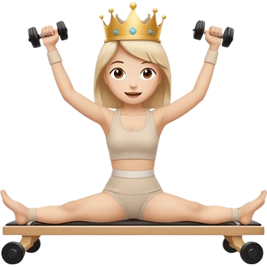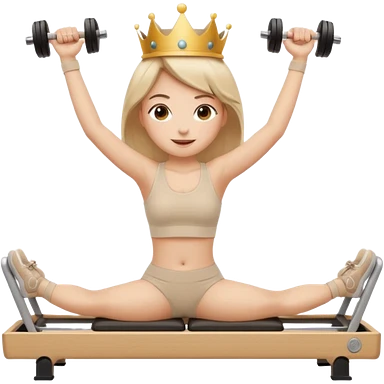 Sticker emoji of a girl doing Pilates arm exercises on a reformer, holding light dumbbells. Small crown, happy expression, beige outfit. Kawaii proportions, white outline, transparent background. emoji