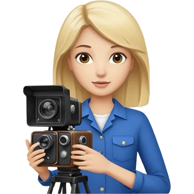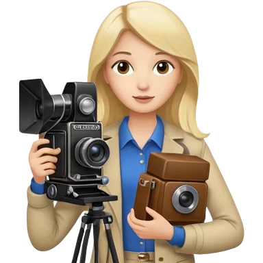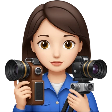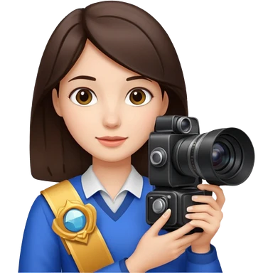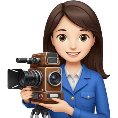 A brunette girl , she’s a proud and successful filmmaker 🍿🌍✨ she’s next to a tall, set camera, / holding awards emoji