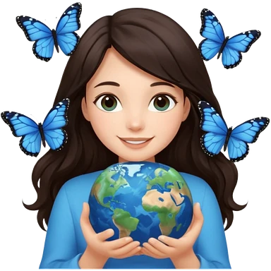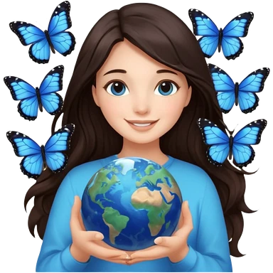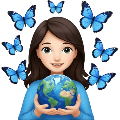 Successful CEO (brunette girl, another emoji, in the middle), holding the Earth 🌍 in her hands smiling warmly, blue monarch butterflies fly around her. emoji