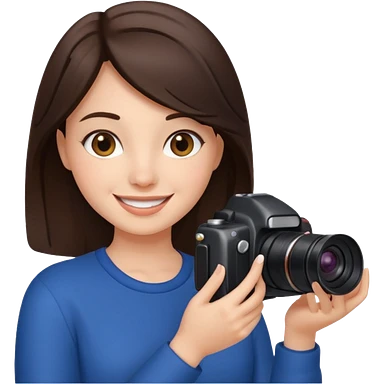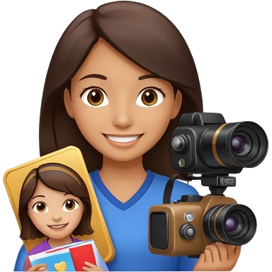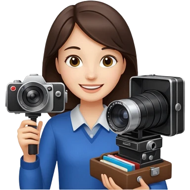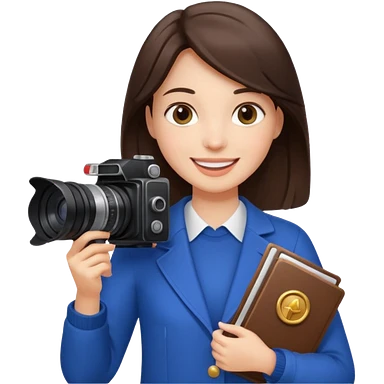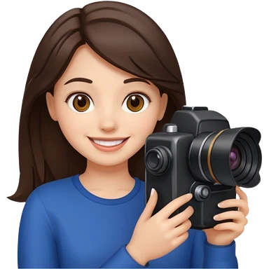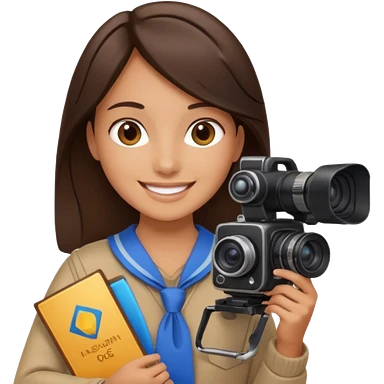 A brunette girl smiling, she’s a proud and successful filmmaker 🍿🌍✨ Holding a camera or behind / next to a camera, / holding awards emoji