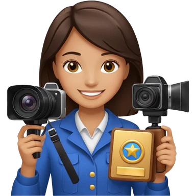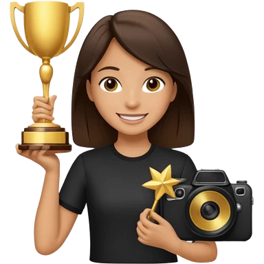 A brunette girl , she’s a proud and successful filmmaker 🍿🌍✨ she’s next to a camera, / holding awards emoji