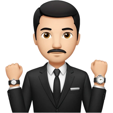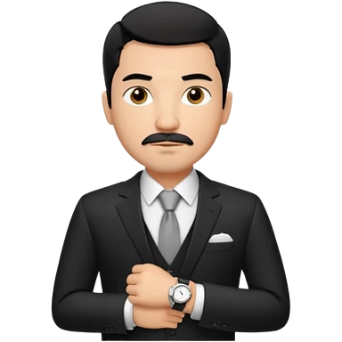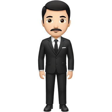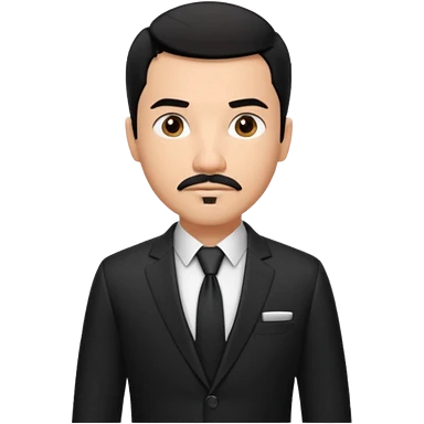 Roupa: terno preto moderno e bem ajustado, com camisa social branca sem gravata (para dar um ar mais contemporâneo), cinto de couro preto e relógio prateado. Tom de pele: médio quente Cabelos: curtos e bem penteados PRETOS Rosto: com bigode e cavanhaque leve, expressão firme e confiante. PRETOS emoji