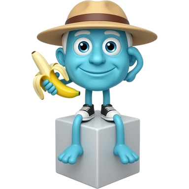 a blue emoji with 3 eyes, wearing a hat, holding a banana, standing on a cube emoji