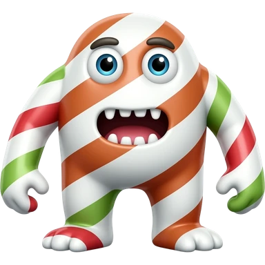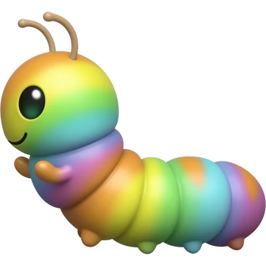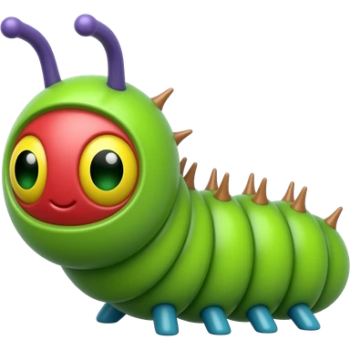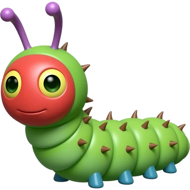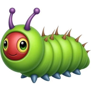 a small, bright green larva with a round red face, two yellow-and-green eyes, and purple antennae. Its segmented body features a row of tiny brown tufts along its back and is supported by several sets of small blue legs. emoji