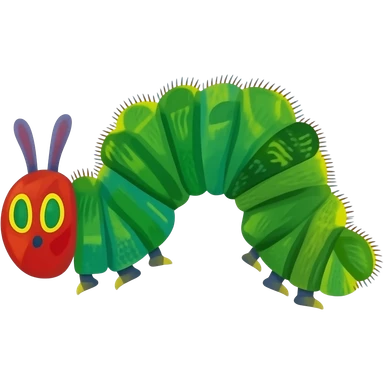 The Very Hungry Caterpillar is a small, bright green larva with a round red face, two yellow-and-green eyes, and purple antennae. Its segmented body features a row of tiny brown tufts along its back and is supported by several sets of small blue legs. emoji