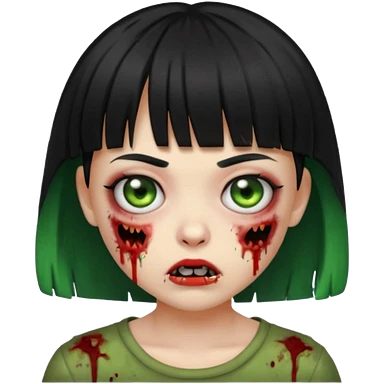 Emoji zombie girl verde com cabelo preto liso curto com franja pro lado com uma blusa preta emoji